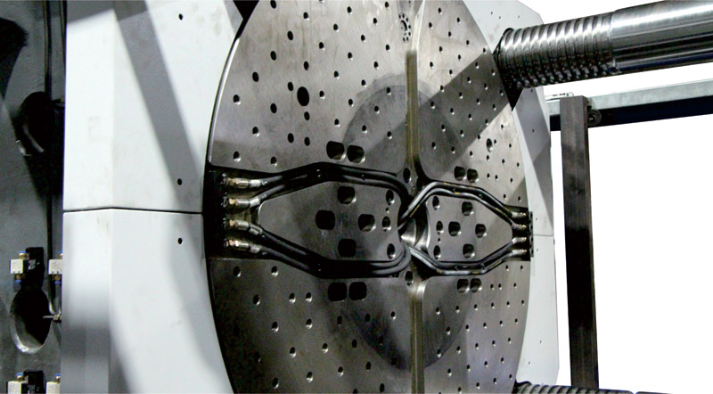 獨特精準的轉盤定準裝置,可確保鎖模平穩,防止模具損傷。