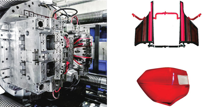 射出部分有兩組獨立之料管組,同步做射出動作,雙色一次成型,可大幅縮短成型周期,增加經營利潤。